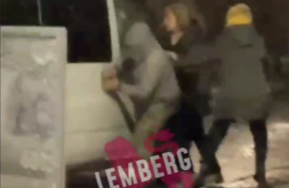 На відео чути несамовитий крик чоловіка, який лунає з буса, і видно жінок, які намагаються визволити "полоненого", але безрезультатно.