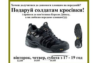 На сторінці громадської організації «Допоможи фронту» в інтернет-мережі «Facebook» розмістили ілюстроване оголошення про те, що волонтери збиратимуть біля пам’ятника королю Данилу на площі Галицькій у Львові кросівки для бійців на передовій сьогодні, 12 травня, а також у четвер, 14-го, й у суботу, 16-го (зі 17.00 до 19.00).