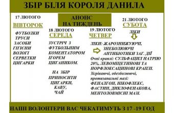 Активісти громадської ініціативи «Допоможи фронту» розмістили на своїй сторінці в інтернет-мережі «Facebook» ілюстроване повідомлення про те, яку допомогу волонтери збиратимуть бійцям 18-19 і 21 лютого (зі 17. 00 до 19.00) біля пам’ятника королю Данилу на площі Галицькій у Львові. На сторінці громадської ініціативи «Допоможи фронту» в інтернет-мережі «Facebook» повідомляється також: