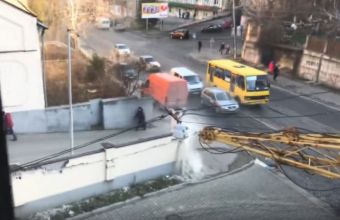Вантажівка-кран, яка працює на будівництві на вулиці Скляній, пошкодила паркан.