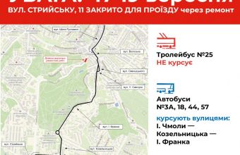 Через ремонт на вул. Стрийській, 11 не курсують тролейбуси №25, а автобуси чотирьох маршрутів об`їжджають по вул. Чмоли – Козельницькій – І. Франка.