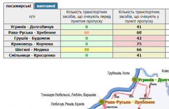 333 транспортні засоби очікують у прикордонних автомобільних пунктах пропуску на Львівщині, ще 40 скупчилися перед пунктом пропуску «Шегині», а 60 – перед пунктом пропуску «Рава-Руська».