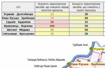 225 транспортних засобів очікують у чергах у пунктах пропуску на Львівщині, а ще 380 скупчилися перед ними.