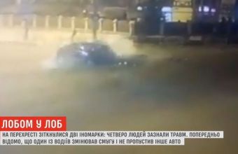 А в «Телевізійній службі новин» каналу «1+1» розповіли: «У Львові на перехресті двох вулиць лобом у лоб зіткнулися дві іномарки. Момент зіткнення зняли камери відеоспостереження. Від зіткнення позашляховик розкрутило на 360 градусів, він пробив металевий паркан і опинився на узбіччі. 43-річного водія і трьох пасажирів ушпиталили. У другому авто був лише водій, він не постраждав».