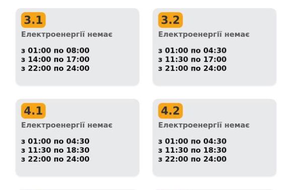 Група 3.2. Електроенергії немає з 01:00 до 04:30, з 11:30 до 17:00, з 21:00 до 24:00.