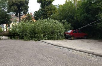 Дерево, яке впало біля інфекційної лікарні на вулиці Пекарській, накрило два автомобілі.