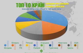 Найбільше в Україну приїздило знову ж таки із країн, що межують з нашою державою. І тут лідерами стали громадяни Молдови – 933 тис., Білорусі – 463,5 тис., РФ –390 тис., Польщі –272 тис., Румунії – 229 тис та Угорщини – 217 тис. А також Туреччини –149 тис., Німеччини – 74 тис., Ізраїлю – 57 тис. та США – 42 тис.