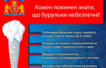 У Головному управлінні ДСНС України у Львівській області повідомили в середу, 9 січня: «Погода, коли вдень сонячно, а вночізаморозки, що провокує значні перепади температури повітря – сприятливі умови для утворення крижаних бурульок. Також небезпечним є значне нагромадження снігового покриву на дахах будівель (особливо старих будинків з похилим дахом), виступаючих архітектурних частинах будинків та великих деревах».