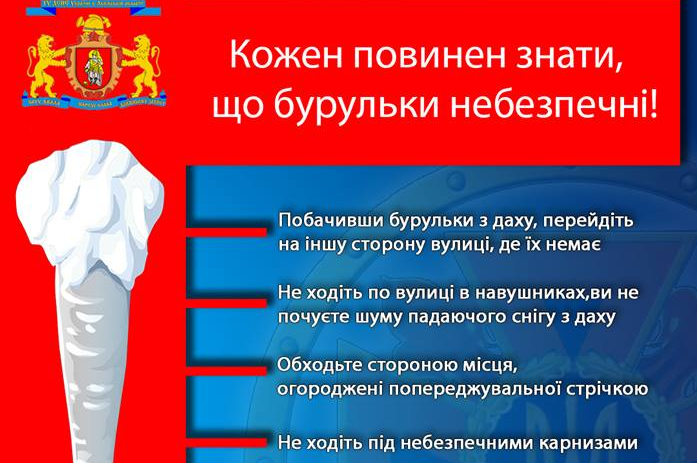 Відтак, у Головному управлінні ДСНС України у Львівській області порадили: «Пересуваючись містом в період танення льоду, слід бути особливо уважним, проходячи повз будинки чи біля високих дерев. Переконайтеся у відсутності загрози падіння льодових наростів. По можливості необхідно триматись на відстані трьох-п’яти метрів від будинків та інших споруд, вибираючи найбільш безпечний маршрут руху. Власникам автотранспорту не варто паркувати свої машини біля будинків. Ні в якому разі не заходити за попереджуючі стрічки поблизу будинків чи дерев. Якщо через падіння з даху бурульки або снігу постраждала людина, треба викликати швидку допомогу».
