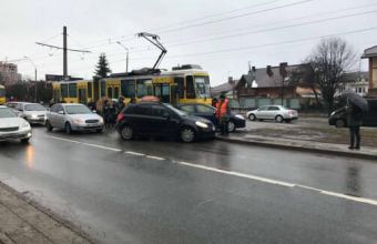 У понеділок, 11 лютого, на вулиці Княгині Ольги у Львові не розминулися легковик і трамвай.