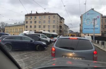 Трамваї зупинилися через ДТП на площах Соборній і Митній у Львові.