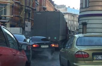 Фура застрягла в центрі Львова й заблокувала рух транспорту