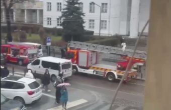 На відео — черга з пожежних автомобілів. яка вибудувалася з вулиці Чернігівської на вулицю Пекарську, де розташований виш. Рух транспорту зупинено.