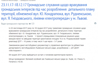 «Замовником даної містобудівної документації є управління архітектури та урбаністики департаменту містобудування Львівської міської ради, розробником — ДП ДІМП «Містопроект». 8 грудня 2017 року відбудеться зустріч з головним архітектором проекту. Місце проведення – великий сесійний зал Львівської міської ради (площа Ринок,1). Початок – о 16.00», – поінформували також у міськраді.
