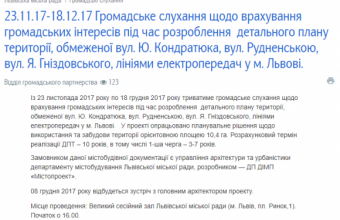 У середу, 23 листопада, розпочнеться громадське слухання щодо врахування громадських інтересів під час розроблення детального плану території, обмеженої вулицями Кондратюка, Рудненською й Гніздовського та лініями електропередач у Львові, яке триватиме до 18 грудня. Про це повідомили в прес-службі Львівської міськради, де також розповіли: «У проекті опрацьовано планувальне рішення щодо використання та забудови території орієнтовною площею 10,4 га. Розрахунковий термін реалізації ДПТ – 10 років, в тому числі першша черга – три-сім років».