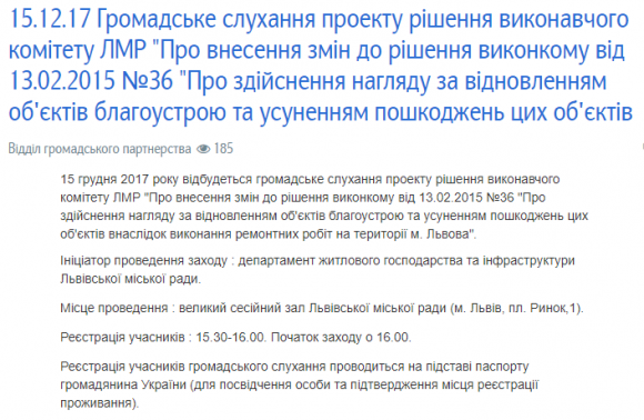 Про це повідомили в прес-службі Львівської міськради, де також конкретизували, що департамент житлового господарства та інфраструктури ЛМР ініціював громадське слухання проекту рішення її виконкому «Про внесення змін до рішення виконкому від 13.02.2015 №36 «Про здійснення нагляду за відновленням об'єктів благоустрою та усуненням пошкоджень цих об'єктів».