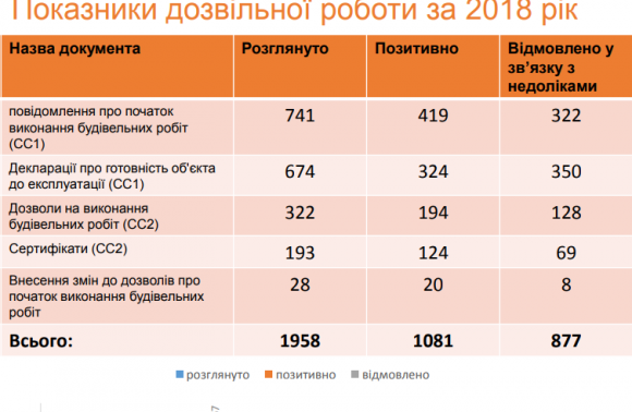Про це повідомили в середу, 23 січня, в прес-службі Львівської міськради, де також розповіли: «2018 року Інспекцією державного архітектурно-будівельного контролю у Львові було розглянуто 741 повідомлень про початок виконання будівельних робіт (позитивно – 419, відмовлено у зв’язку з недоліками – 322), 674декларацій про готовність об'єкта до експлуатації (позитивно – 324, відмовлено у зв’язку з недоліками – 350), 322 дозволи на виконання будівельних робіт (позитивно – 194, відмовлено у зв’язку з недоліками – 128), 193 сертифікати (позитивно – 124, відмовлено у зв’язку з недоліками 69) та внесення 28 змін до дозволів про початок виконання будівельних робіт (позитивно – 20, відмовлено у зв’язку з недоліками вісім)», – поінформували також у ЛМР.
