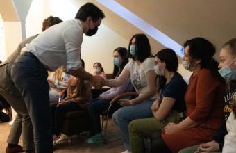 Прем'єр-міністр Джастін Трюдо потискає руки під час візиту з українськими біженцями у Варшаві, Польща.