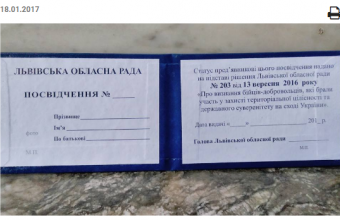 У Львівській обласній раді повідомили сьогодні, 18 січня, що на її замовлення вже виготовили перші посвідчення бійців-добровольців АТО, які брали участь у захисті територіальної цілісності та державного суверенітету на сході України. Відтак їх передадуть у департамент соціального захисту населення ЛОДА, де усі визнані учасниками війни зможуть отримати відповідні посвідчення уже найближчим часом.