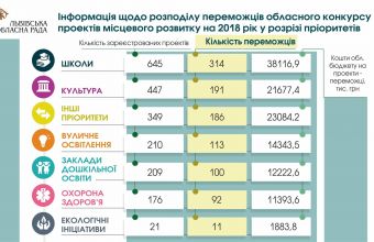 «Отож, у підсумку в 2018 році маємо 1007 переможців Конкурсу проектів місцевого розвитку загальною вартістю – 253 мільйони гривень, з яких 122,7 млн. гривень – кошти обласного бюджету», – повідомили також в прес-службі Львівської міськради.