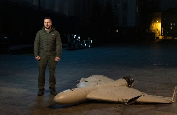 Президент Володимир Зеленський у Києві біля збитого дрона.