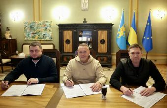 (зліва направо) перший заступник голови Львівської облради Юрій Холод, підприємець Ігор Гринкевич, начальник ЛОВА Максим Козицький підписують меморандум про співпрацю