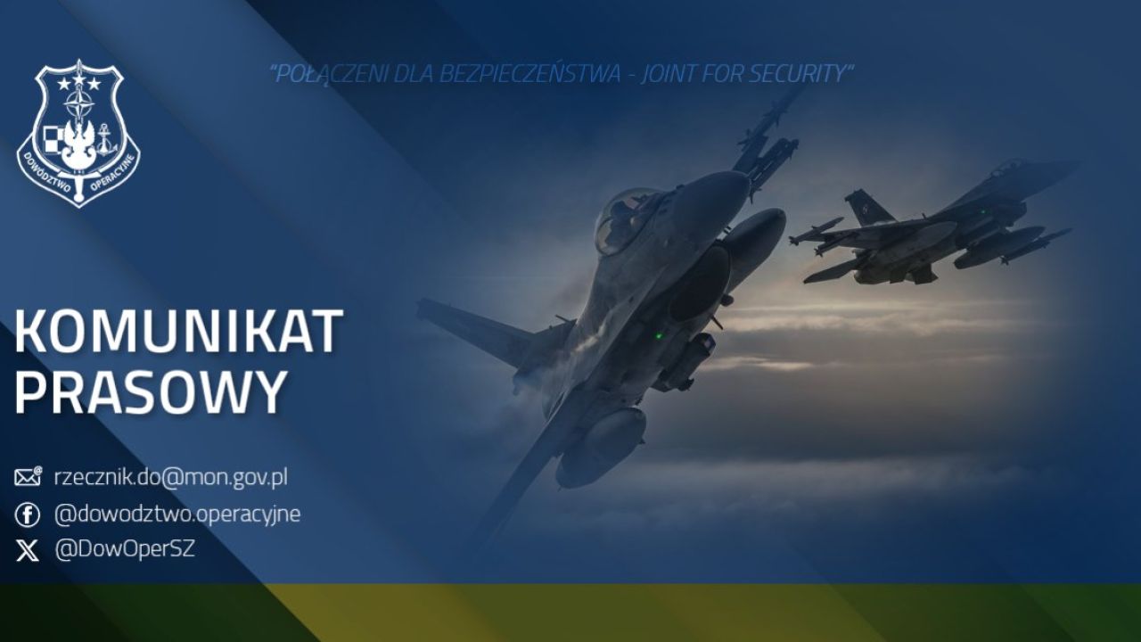 "У зв’язку з інтенсивною діяльністю дальньої авіації Російської Федерації, яка завдає ударів по об’єктах, розташованих, зокрема, на заході України, у нашому повітряному просторі почала діяти польська та союзницька авіація, - йдеться у повідомленні, яке опублікувало Оперативне командування Війська Польського (Dowództwo Operacyjne). - Відповідно до чинних процедур оперативний командувач Збройних сил області мобілізував усі наявні сили та засоби.