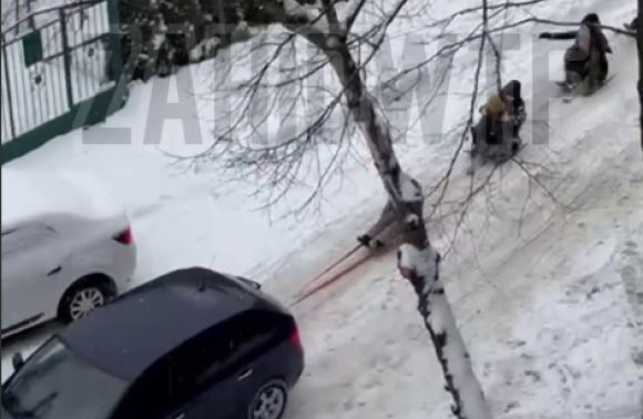 На відео: до легковика вчеплено кілька дитячих санчат, які він з гірки тягне за собою.