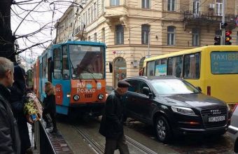 На перетині вулиць Словацького й Дорошенка утворився затор через припаркований впритул до колії автомобіль.