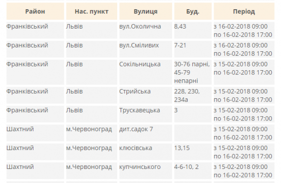Зокрема, в Залізничному районі Львова обленерго знеструмило в п’ятницю, 16 лютого, до 17:00 вулиці Доробок і Загородню, а також будинки №50, №54, №58 та №59 на вулиці Повітряній і №№1-55 на вулиці Пропелерній, у Франківському районі Львова – вулицю Куликівську й будинки №8 та №43 на вулиці Околичній, №№7-21 на вулиці Сміливих, №№30-76 (парні) та №№45-79 (непарні) на вулиці Сокільницькій, №228, №230 та №234а на вулиці Стрийській і №3 на вулиці Трускавецькій, а в Брюховичах – вулицю Вербівка. Про це повідомили в прес-службі «Львівобленерго».