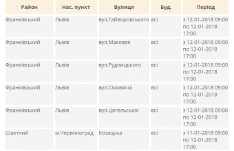 Зокрема, у Личаківському районі Львова обленерго знеструмило до 17-ї години 12 січня вулицю Кузьми й будинки №№2-73 на вулиці Соколиній і №№ 72-115 на вулиці Тракт Глинянський, у Франківському районі Львова – вулиці Воля, Гайворовського, Маковея, Рудницького, Сімовича й Цегельської та будинки №№ 136-160 на вулиці Генерала Чупринки, а в Брюховичах – вулиці Кліматичну, Приколійову, Тепличну й Шкільну. Про це повідомили в прес-службі «Львівобленерго».