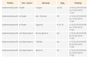 Зокрема, у Личаківському Залізничному районі Львова обленерго знеструмило в понеділок, 19 лютого, до 17:00 вулицю Черемшини, у Шевченківському районі Львова – будинки №19 на вулиці Корінній, №№22-45 на вулиці Східній, №39 на вулиці Леннона й №9, №16 та №18 на вулиці Щурата, у Винниках – вулиці Вузьку, Гриничевої, Кияка й Симоненка, а в Брюховичах – вулиці Дитячу, Бічну Дитячу, Гайову, Зоряну, Квітневу, Мазепи, Під Осовою, Підгірну, Січових Стрільців, Широку, Янівську та Ясеневу. Про це повідомили в прес-службі «Львівобленерго».