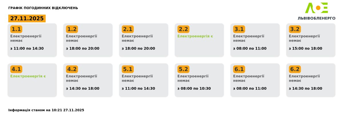 Група 1.1. Електроенергії немає з 11:00 до 14:30.