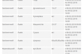 Зокрема, в Залізничному районі Львова обленерго знеструмило в четвер, 8 лютого, до 17:00 для безпечного проведення ремонтних робіт вулиці Геца, Кузнярівка, Сушка й Воля та будинки №№19-27 на вулиці Дучимінської, №№23-37 на вулиці Машиністів і №83а, №85, №85а та №86а на вулиці Широкій, а у Франківському районі Львова до 17:00 – вулиці Воля, Гайворовського, Маковея, Рудницького, Сімовича й Цегельської та будинки №№ 136-160 на вулиці Генерала Чупринки. Про це повідомили в прес-службі «Львівобленерго».