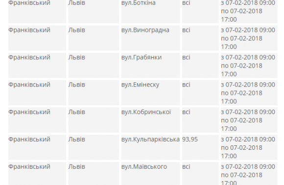 Зокрема, в Залізничному районі Львова обленерго знеструмило в середу, 7 лютого, до 15:00 для безпечного проведення ремонтних робіт будинки №№47-59 (непарні) на вулиці Виговського, а до 17:00 – вулицю Заболотню й будинки №4, №6 та №8 на вулиці Кульчицької, №16, №18 й №№20-56 на вулиці Мацієвича та №№77-121 на вулиці Олесницького. Натомість у Личаківському районі Львова обленерго знеструмило до 17:00 будинок №2а на вулиці Тершаківців, а у Франківському районі Львова до 17:00 – вулиці Боткіна, Виноградну, Грабянки, Емінеску, Кобринської, Маївського та Урожайну й будинки №9 та №95 на вулиці Кульпарківській, №№1-14 на вулиці Шкрібляків, №№1-32 на вулиці Кобилиці й №№21-61 (непарні) на вулиці Молдавській.