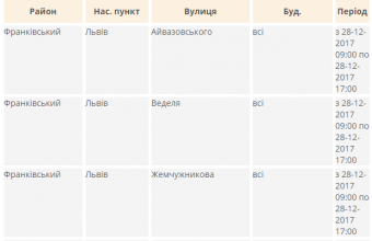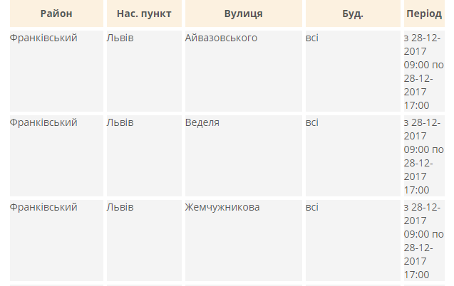 Зокрема, у Галицькому районі знеструмили до 17:00 для безпечного проведення ремонтних робіт будинки №№14-30а та №№21-51 на вулиці Джерельній і №1, №2 та №4 на вулиці Крехівській, у Залізничному районі – будинки №5 на вулиці Скнилівській і №№ 99-131 на вулиці Щирецькій, а в Франківському районі – вулиці Айвазовського, Веделя й Жемчужникова, а також будинки №69, №71, №73, №75 та №77 на вулиці Княгині Ольги, №№38-40 на вулиці Кобилиці, №№46-50, на вулиці Музики, №30а, №53 та №55 на вулиці Наукова й №2, №4, №6, №8 та №10 на вулиці Пулюя, а в Брюховичах – вулиці Бічну Паркова, Дитячу, Паркову й Спортову.