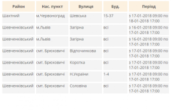 Зокрема, до 17:00 середи, 17 січня, вулицю обленерго знеструмило вулицю Загірну у Шевченківському районі Львова й вулиці Відпочинкову, Коротку та Соловїну й будинки №№1-4 на вулиці Нової України в Брюховичах. Натомість до 17:00 четверга, 18 січня, обленерго знеструмило вулиці Запольської та Ярову у Личаківському районі Львова й вулицю Кондратюка та будинки №77 на вулиці Галицькій і №№12-64 та №№17-61 на вулиці Ціалковського в Брюховичах. Про це повідомили в прес-службі «Львівобленерго».