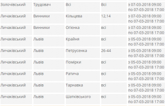 Зокрема, в Залізничному районі Львова обленерго знеструмило сьогодні, 7 березня, до 16:00 будинки №17 на вулиці Калнишевського, №4 на вулиці Мундяка, №18 на вулиці Роксоляни й №12, №8 та №10 на вулиці Суботівській, у Личаківському районі Львова – вулиці Крайню, Помірки, Ратича, Тарнавка й Шатківського та будинки №№26-44 на вулиці Петрусенко, у Франківському районі Львова до 16:00 – вулиці Васильківського, Брюховицьку й Генерала Алмазова та будинки №48 і №46 на вулиці Антоновича й №40,42 та № 44 на вулиці Героїв УПА, у Шевченківському районі Львова до 17:00 – вулиці Генерала Микитки й Павлокомську, а також будинки №112 та №85а на вулиці Замарстинівській і №112 та №85а на вулиці Тучапського, а у Винниках до 17:00 – вулицю Огієнка й будинки №12 та №14 на вулиці Кільцевій. Про це повідомили в прес-службі «Львівобленерго».