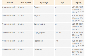 У середу, 29 листопада, «Львівобленерго» знеструмило до 17:00 для безпечного проведення ремонтних робіт: у Галицькому районі – будинки №№257-267 на вулиці Зеленій, у Залізничному районі – вулиці Квітки-Основ’яненка та Орельську й будинки №№36-50 на вулиці Братів Міхновських №1, №3 та №5 на вулиці Комарова, №№1-7 (непарні) на вулиці Самарській, №2, №4, №6, №8, №11, №15 та №23 на вулиці Сяйво й №73, №75, №77, №81, №83 та №83а на вулиці Темницьких, у Франківському районі – вулиці Айвазовського, Веделя, Виноградну, Емінеску, Жемчужникова, Кобринської, Маївського та Урожайну й будинки №№26, №28, №№47-51 (непарні) на вулиці Бойчука, №№3-31, Боткіна, №187 та №195 на вулиці Городоцькій, №№1-18 на вулиці Грабянки, №№42-50 (непарні) Княгині Ольги, №№38-40 на вулиці Кобилиці, №4 та №6, на вулиці Любінській, №3, №11 та №№46-50 на вулиці Музики й №№1-14 на вулиці Шкрібляків, у Шевченківському районі – вулиці Братню, Заміську, Космічну, Очаківську й Шкіряну та будинки №№18-28 на вулиці Збоїща, у Винниках – вулиці Декабристів, Загороддя, Кармелюка, Молодіжну й будинки №№23-45 та №№18-50 на вулиці Сагайдачного. Про це повідомили в прес-службі «Львівобленерго»