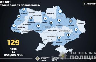 У день голосування зареєстровано 129 повідомлень, пов’язаних із виборчим процесом. Слідчі розпочали чотири кримінальні провадження. Також складено три адміністративних протоколів. Найбільше порушень зареєстровано в Харківській – 59, у Черкаській – 25 та Львівській областях - 10.