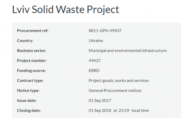 Очікується, що тендер на закупівлю товарів, робіт і послуг для проекту «Тверді відходи Львова» буде оголошений в четвертому кварталі цього року. Раніше повідомлялося, що ЄБРР може надати фінансування в розмірі до €20 мільйонів Львову для подолання «сміттєвої проблеми».