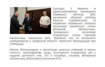 «Сьогодні, 3 березня, в адміністративному приміщенні Львівської митниці ДФС начальник обласної митниці Микола Горобинський та керівники «Львівської обласної організації української спілки ветеранів Афганістану», громадської організації «Українська спілка інвалідів Афганістану, локальних війн, збройних сил та загального захворювання у Львівській області» підписали Меморандум про співпрацю. Метою Меморандуму є організація широкої співпраці в межах чинного законодавства щодо поліпшення координації дій у наданні допомоги тим, хто її потребує, зокрема, ветеранам Афганістану, військовим учасникам АТО.