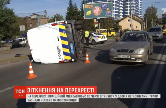 «Телевізійна служба новин» каналу «1+1» повідомила в середу, 2 жовтня: ««Львівські поліціянти влаштували автотрощу. За попередніми даними, легких травм зазнали четверо правоохоронців. Це працівники конвойної служби».