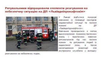 «У Львові відбулися показові навчання із ліквідації наслідків надзвичайної ситуації та гасіння пожежі на ДП «Львівдніпронафтохім». Навчання проводилися з метою вдосконалення пожежно-тактичних знань і практичних навичок рятувальників під час гасіння пожеж та рятування людей із задимленої зони, а також налагодження взаємодії між екстреними службами у випадку реагування на небезпечну подію.