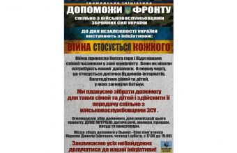 «Це спільна акція волонтерів та військовослужбовців до Дня Незалежності Україні. Громадська ініціатива «Допоможи фронту» починає збір допомоги для дітей, що постраждали від війни.