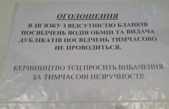 На сторінці громадської організації «Варта 1» в інтернет-мережі «Facebook» повідомили сьогодні, 12 січня: «У зв’язку з відсутністю бланків на посвідчення водія, у Львівському територіальному сервісному центрі посвідчення тимчасово не видаються. Керівництво ТСЦ гарантує, що бланки будуть у Львові з вівторка, 16 січня».