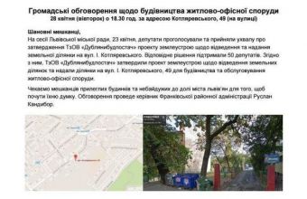 «Сьогодні, 28 квітня, о 18.30 на вулиці Котляревського, 49 розпочнуться громадські обговорення щодо будівництва тут житлово-офісної споруди. Нагадаємо, на сесії Львівської міської ради 23 квітня депутати проголосували та прийняли ухвалу про затвердження ТзОВ «Дублянибудпостач» проекту землеустрою щодо відведення та надання земельних ділянок на вулиці Котляревського.