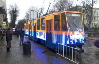 На вулиці Львова виїхав трамвай зі святковою ілюмінацією