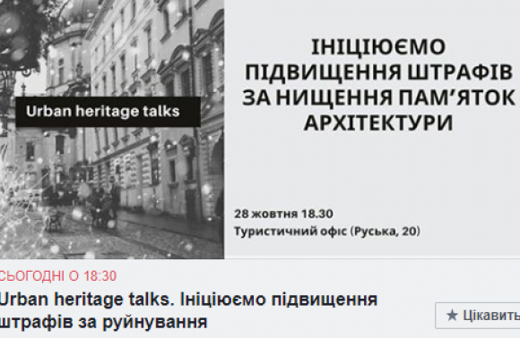 У понеділок, 28 жовтня, о 18.30 у туристичному офісі в будинку №20 на вулиці Руській у Львові розпочнеться публічне обговорення наміру міськради ініціювати підвищення штрафів за нищення пам’яток архітектури.