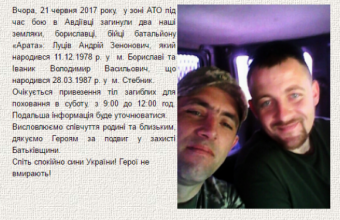 У Львівській облдержадміністрації повідомили сьогодні: «Львівщина втратила двох героїв. 21 червня, свої життя, захищаючи Батьківщину, віддали двоє бориславців – Андрій Луців та Володимир Іваник. Бійці батальйону «Аратта», загинули на бойовий позиції у місті Авдіївка в Донецькій області».